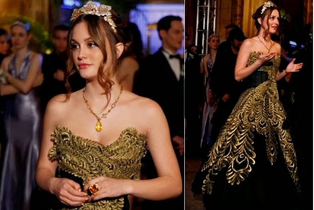 This beautiful baby blue floral gown that Blair wore to her wedding to Chuck Bass (insert fangirl squeal here) was exactly what I had imagined that Queen B would look like on her wedding day. I feel that blue has always been Blair's color, and that the style of the gown is very sophisticated and chic. Most of all, the golden headband is the most iconic fashion accessory to ever grace the Gossip Girl screen.